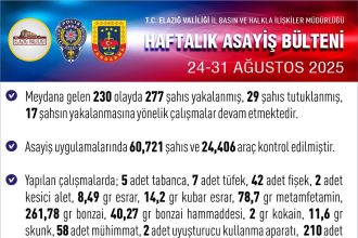 Valilik, 24-31 Ağustos verilerini açıkladı: Binlerce araç ve kişi denetlendi, çok sayıda silah ve uyuşturucu ele geçirildi. Elazığ Valiliği, 24-31…